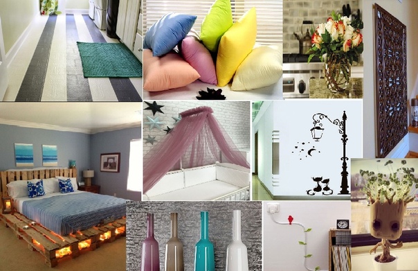 Скучно и надоело пространство вокруг? Лови несколько простых и недорогих идей для декора дома 1. Можно покрасить в стильные цвета и освежить батареи, линолеум, мебель, стены) Покрасить можно в цвет комнаты или контрастно – на ваш вкус. 2. Организуйте балдахин. Всего-то нужно несколько дешевых карнизов и недорогих штор. А каков эффект! Романтическое настроение и уют гарантированы! Показать полностью…3. Из старых остатков ткани, которые до сих пор не находили применения, можно пошить оригинальные чехлы для подушек и покрывал или декоративные салфетки. 4. Виниловые наклейки. Это не дорого, красиво, удобно и разнообразие выбора Вас точно удивит. Можно найти себе вариант в любое помещение или обклеить холодильник! А если Вам надоела старая наклейка или ее просто нужно снять — прогрейте ее воздухом из фена и легко снимите. 5. Декоративные рамки. В них можно обрамить телевизор, розетки, выключатели - эффект от этого дизайнерского трюка превзойдет ваши ожидания. 6. Замаскируй неприглядное вентиляционное отверстие с помощью резинового коврика и краски металлик. Замечательная находка! 7. Вазы или любые другие емкости помогут украсить дом яркими акцентами, соответствующими времени года. Весной это могут быть цветы, летом — фрукты, осенью — композиции из листьев, зимой — хвойные ветки. 8. Новые оригинальные «домики» для цветов, которые будут радовать глаз и станут изюминкой интерьера. 9. Спрячь провода. Есть несколько вариантов: обмотать его с помощью толстой веревки или ленты, прикрыть их с помощью панели или шторки, придать форму рисунка и закрепить на стене зажимами 10. Поддоны. Хотите удобную деревянную кровать — возьмите поддоны, диван на летнюю террасу — снова они, красивые подставки для цветов и место для высадки зелени — поддоны. В какой цвет покрасить, какую часть отрезать, а какую использовать, чем задекорировать и украсить — решать вам. Поддоны долго прослужат в качестве элемента декора и станут изюминкой интерьера. 11. Галерея прямо дома. Достаточно лишь выбрать картины или фото одной тематики и устроить их в красивую композицию на стене. Можно использовать фото свои, семьи, друзей и близких, создавать коллажи, которые будут радовать вас каждый день) 12. Шторы. Несмотря на то, что шторы уже являются самостоятельным украшением помещения, их также можно задекорировать. Сделать это очень просто. Для детской комнаты используйте мягкие игрушки в качестве подхватов. Также для фиксации занавесок подойдут оригинальные прищепки, бусинки и цветы. 13. Стеклянные бутылки. Очень простой и эффектный элемент декорирования. Заполняйте их красивыми цветными жидкостями, песком, камушками, крупами, украшайте лентами, веревками, используйте как вазу или составьте композиции из бутылочек.