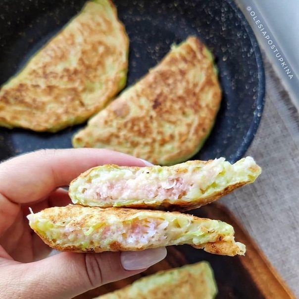 ЧЕБУРЕКИ ИЗ КАБАЧКА С ВЕТЧИНОЙ И СЫРОМ?Ингредиенты:- 500г кабачка (без кожи и семян)- 100г мукиПоказать полностью…- 1 яйцо- зубчик чеснока- пару перышек зеленого лука- 100г ветчины из индейки- 60г сыра (Российский)- соль, перец- моя любимая сковорода.?Приготовление:Кабачки натереть на терке, посолить, оставить на 5 минут, потом отжать. Добавить к кабачкам муку, яйцо, соль, перец, перемешать - получится тесто как на оладьи.Сыр, ветчину, чеснок натереть на мелкой терке, добавить мелко нарезанный лук, перемешать, получится начинка.?2 столовые ложки теста выкладываем на прогретую сковороду, формируем лепешку, ждем, когда верх схватится, выкладываем на половинку начинку, накрываем второй половинкой, края прижимаем лопаткой, они слипнутся, жарим с 2 сторон до румяной корочки.Приятного аппетита!